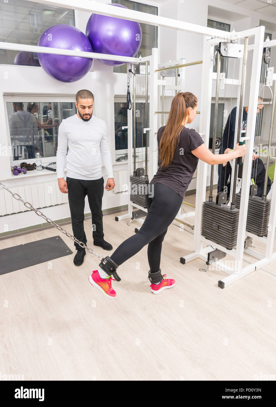 Woman Training Legs With Sport Instructor At Gym Using Cable Crossover Machine Stock Photo Alamy